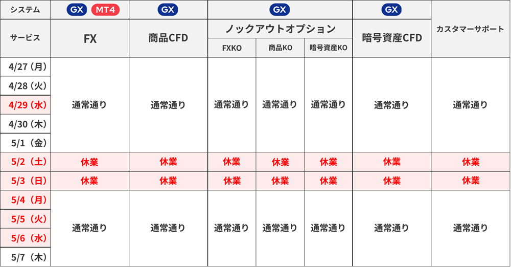 ゴールデンウィーク中は、スプレッドが拡大しやすい状況が続く可能性がございますので、建玉や資金の管理は充分な余裕をもって行っていただきますようお願い申しあげます。