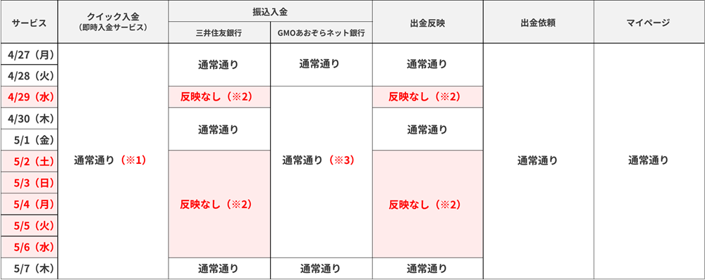 ・ゴールデンウイーク期間中の土日祝日にクイック入金の反映が正常に行われなかった場合は、銀行営業日の4月30日(木)、5月1日(金)、5月7日(木)以降の反映となります。