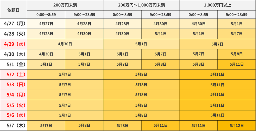 連休中に当社マイページで出⾦依頼をしても、着⾦はゴールデンウィーク明けの銀⾏営業⽇(5⽉7⽇)以降となる場合があります。詳細については【出金依頼日時・出金額別の着金予定日】をご確認ください。