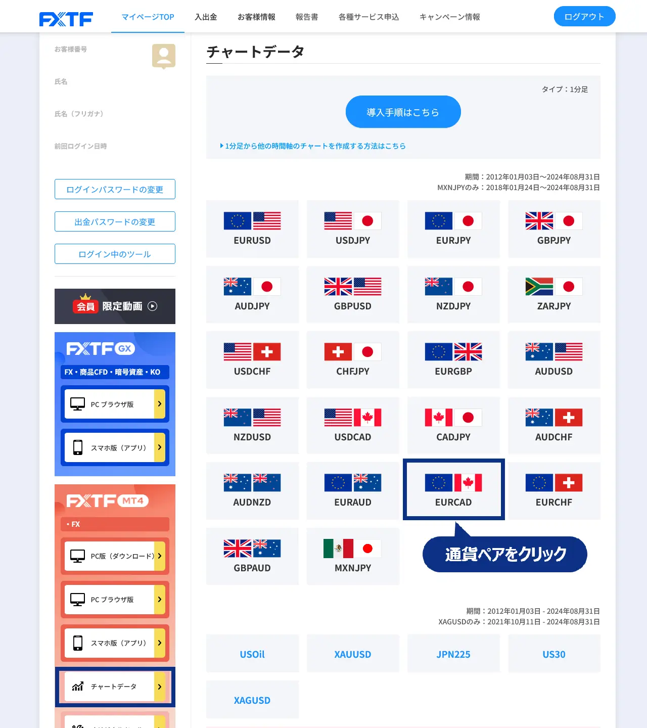 ヒストリカルデータ(過去のチャートデータ)をマイページからダウンロードして、ご使用のPCに保存します。