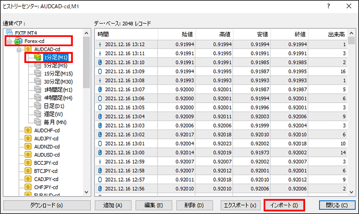 該当通貨ペアの1分足をダブルクリックするとデータベース内にインポート前のデータ一覧が表示されます。「インポート」ボタンをクリックします。